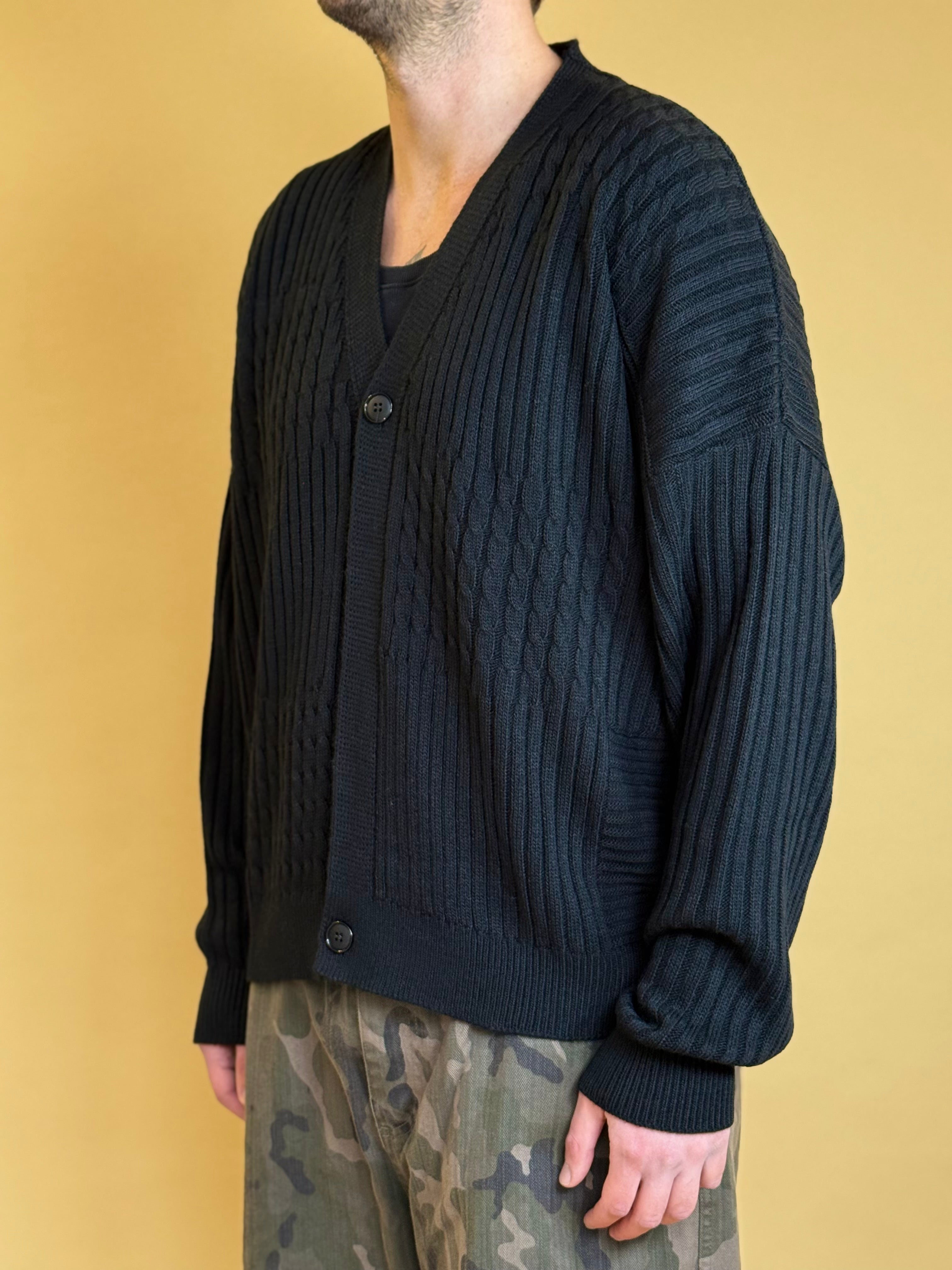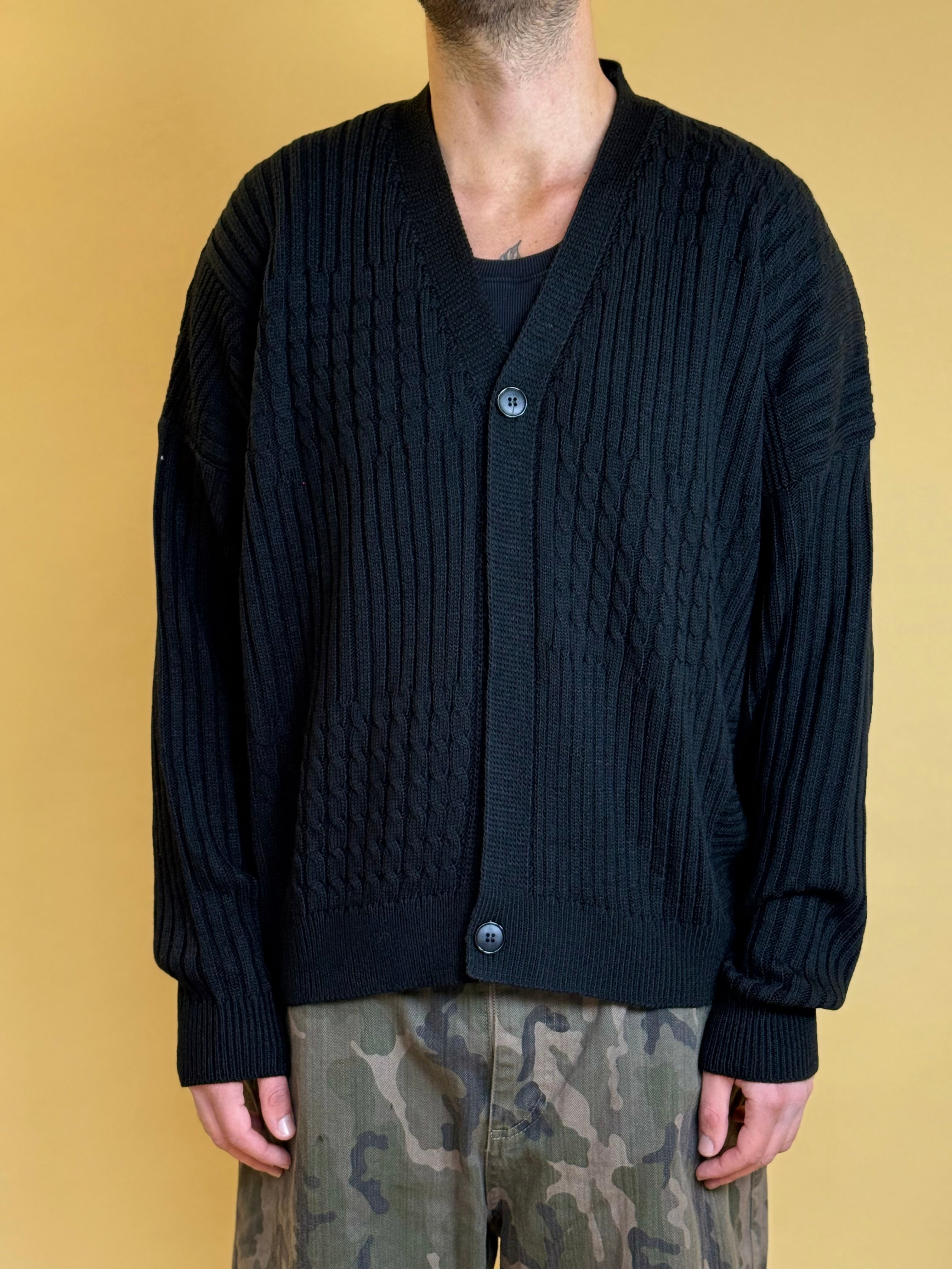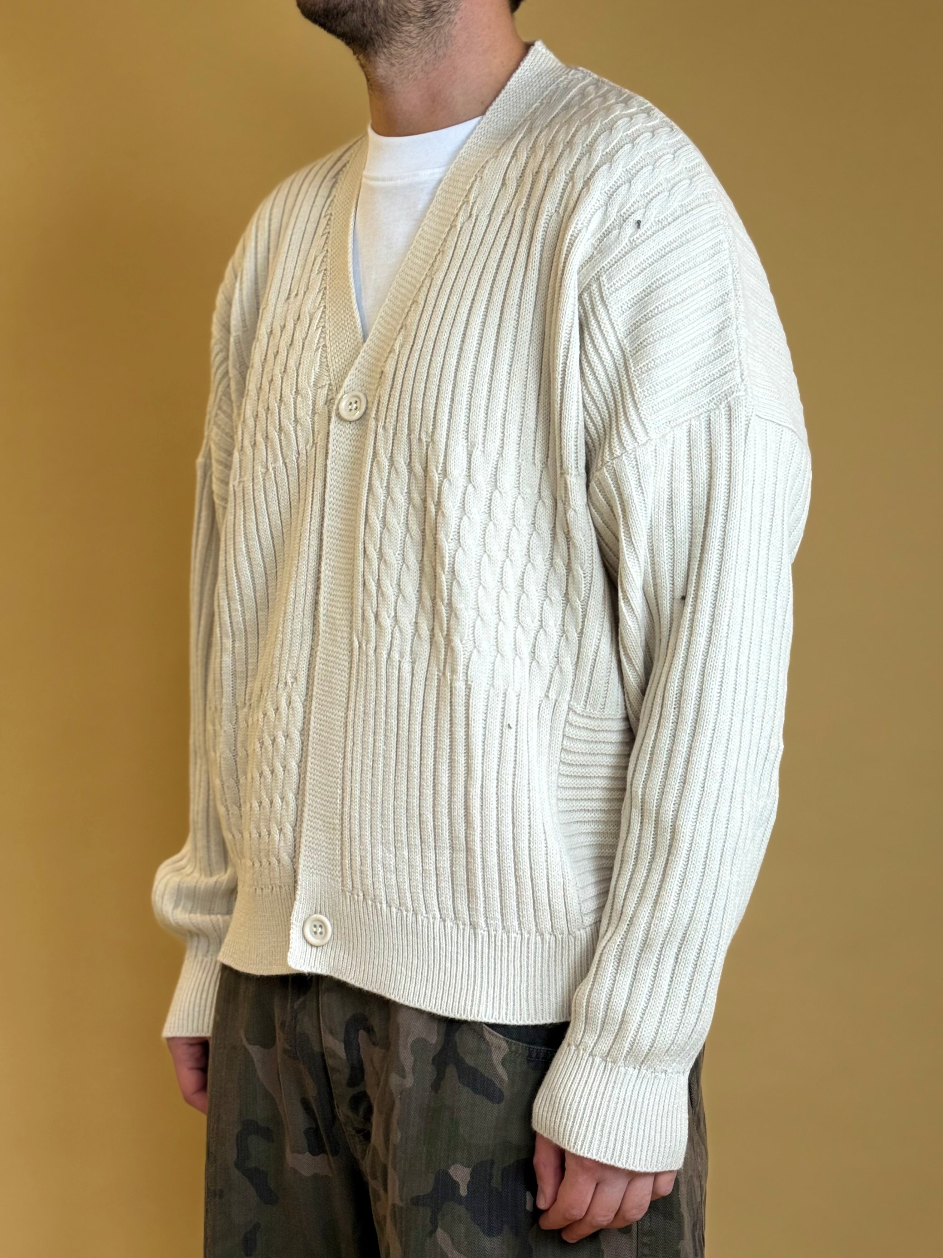 Cardigan dalla vestibilità leggermente crop ed oversize, con varie trame e costa larga. La particolarità più rilevante è la chiusura frontale a 2 bottoni, mentre le rifiniture sono in costina. E' disponibile in 2 varianti colore.
