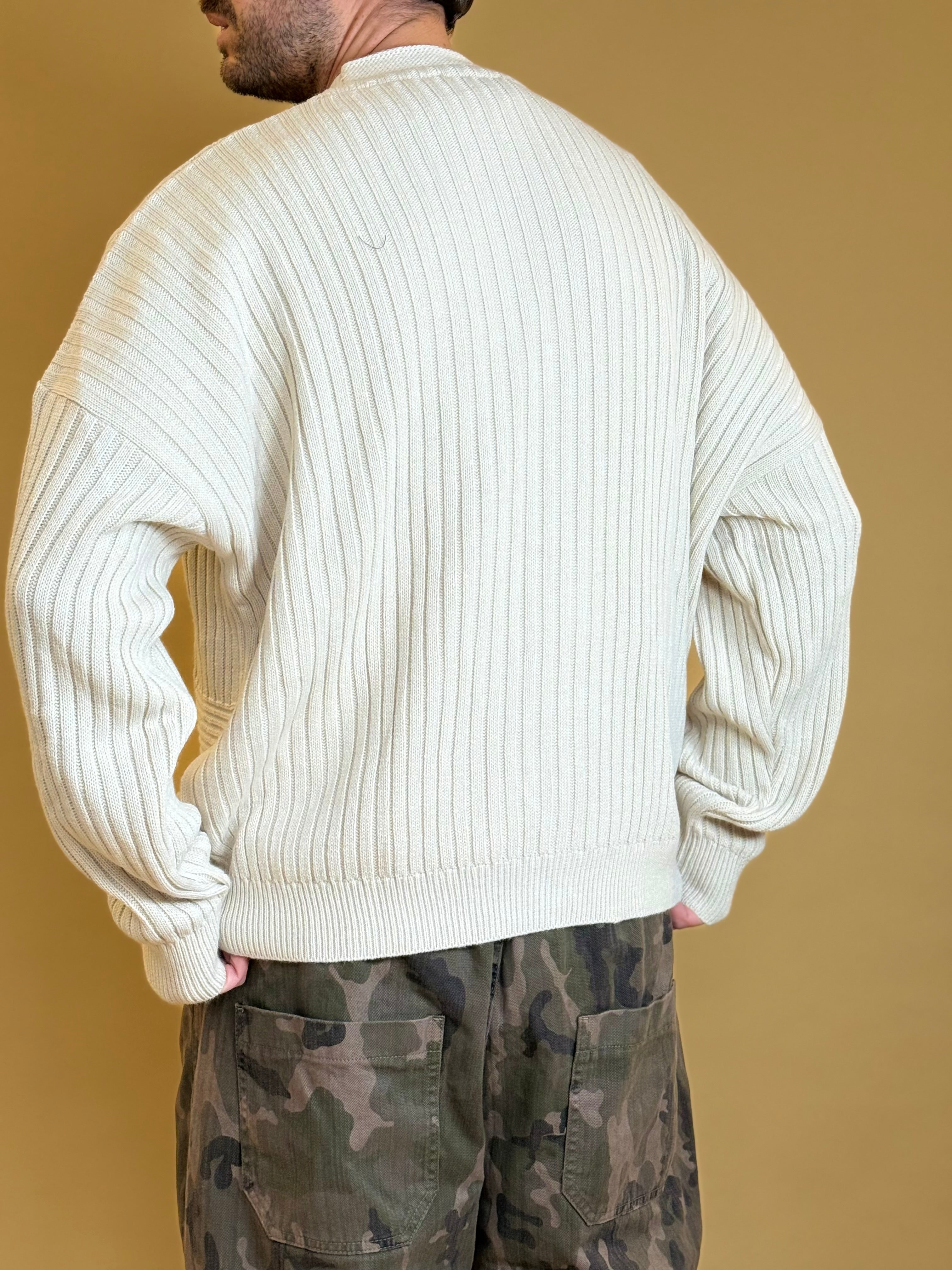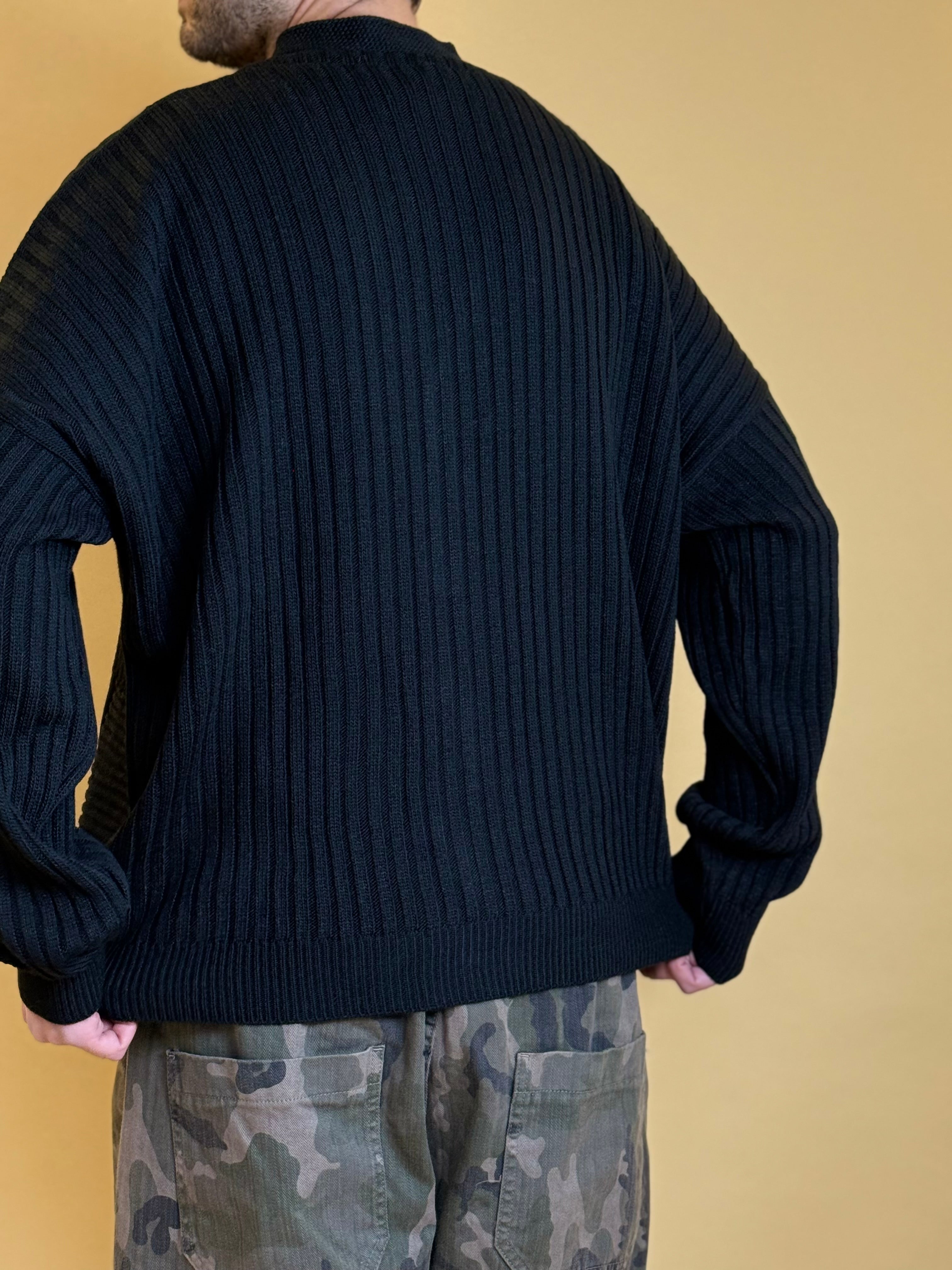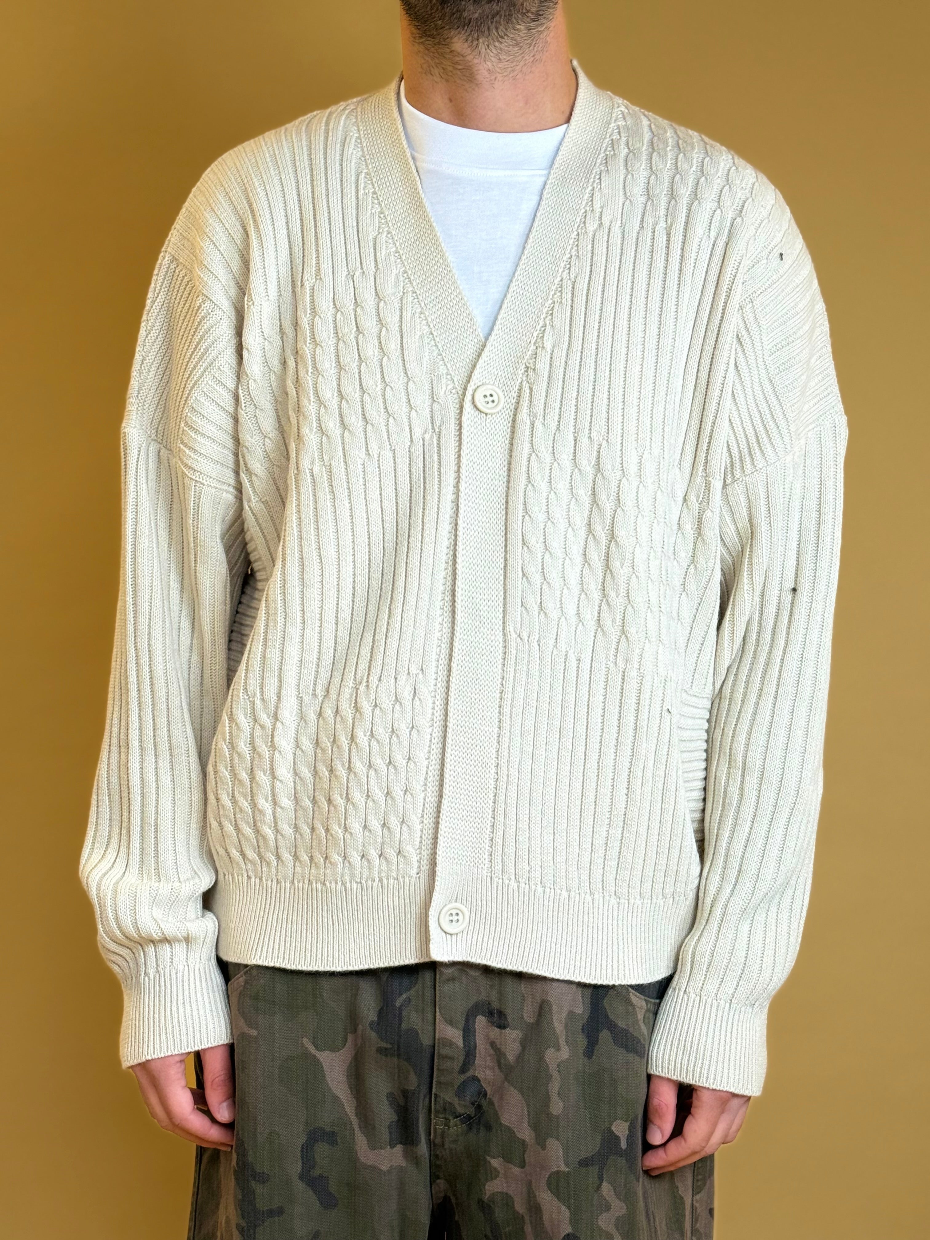 Cardigan dalla vestibilità leggermente crop ed oversize, con varie trame e costa larga. La particolarità più rilevante è la chiusura frontale a 2 bottoni, mentre le rifiniture sono in costina. E' disponibile in 2 varianti colore.