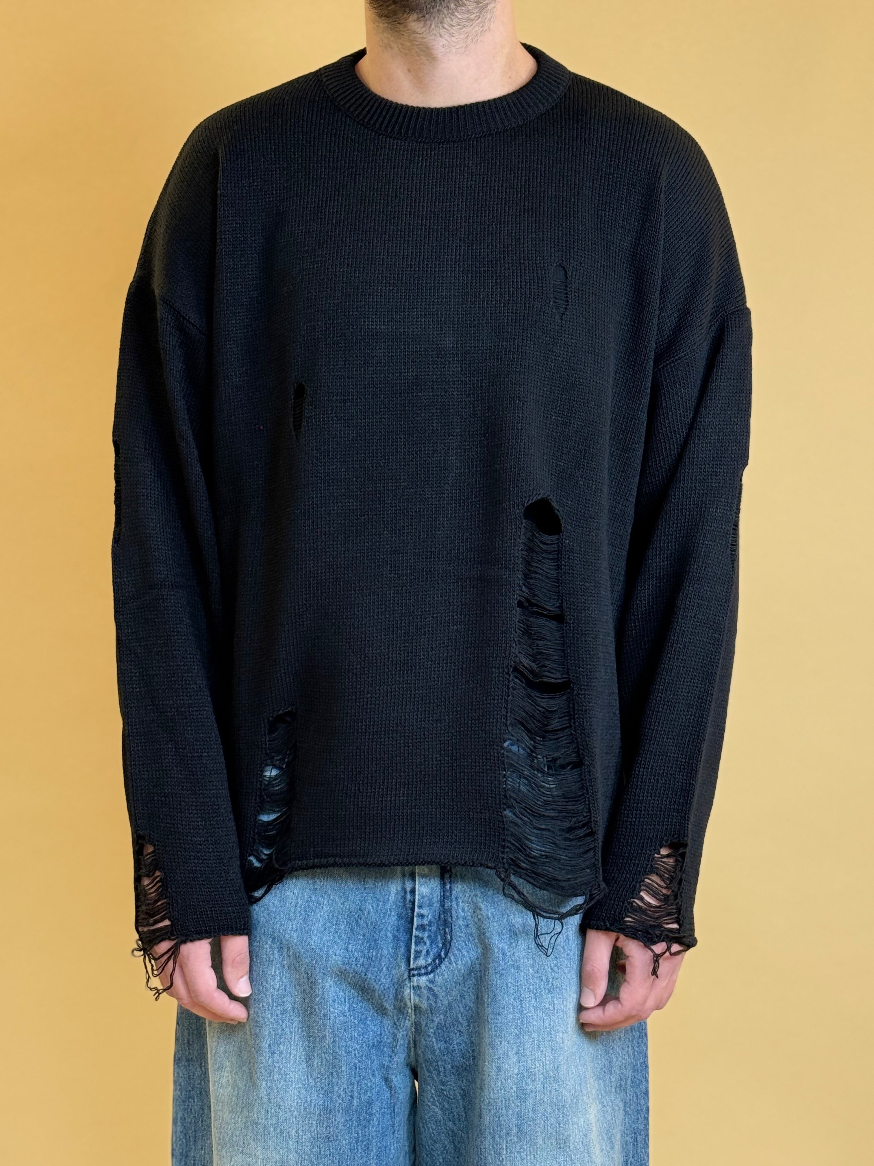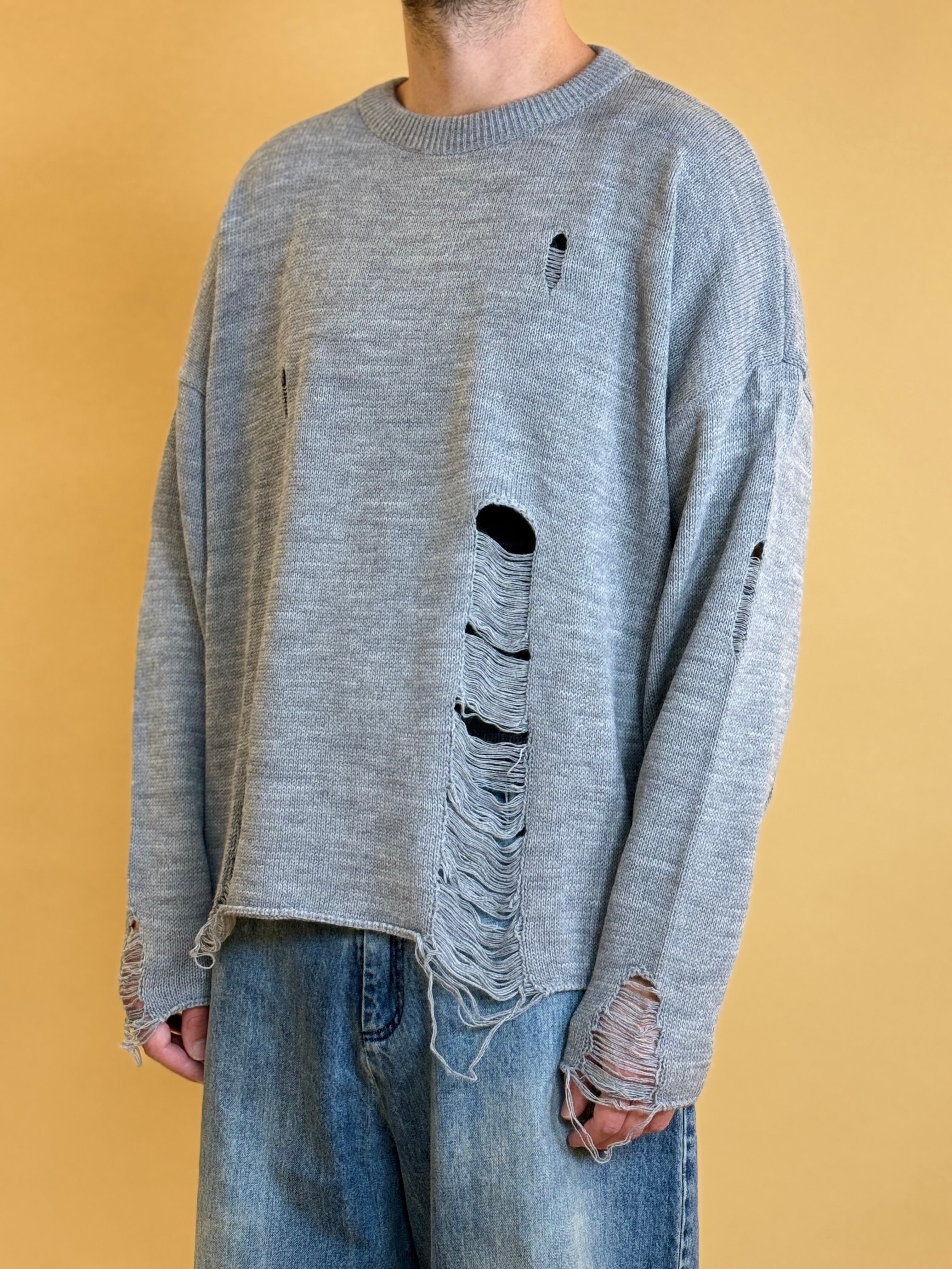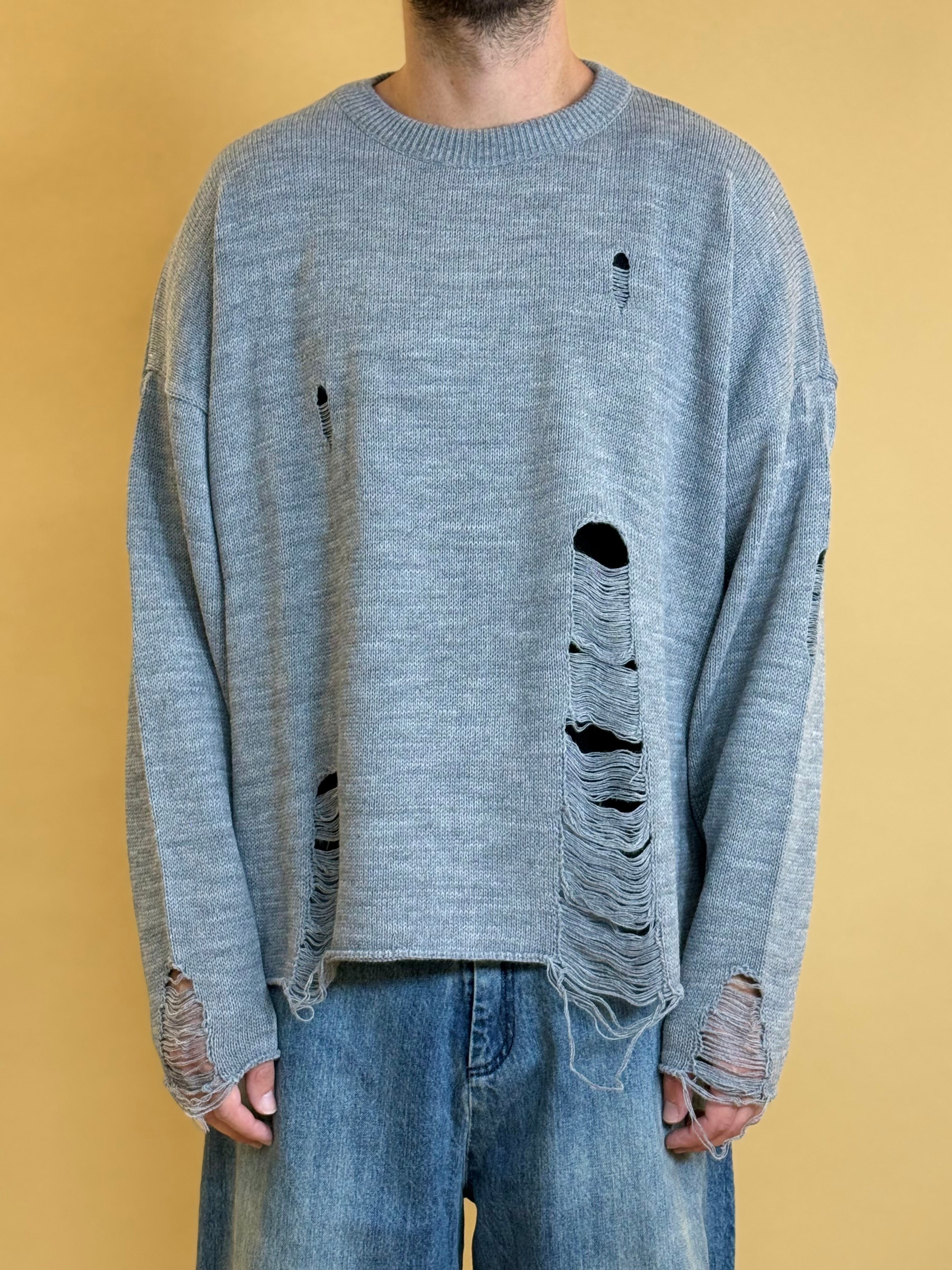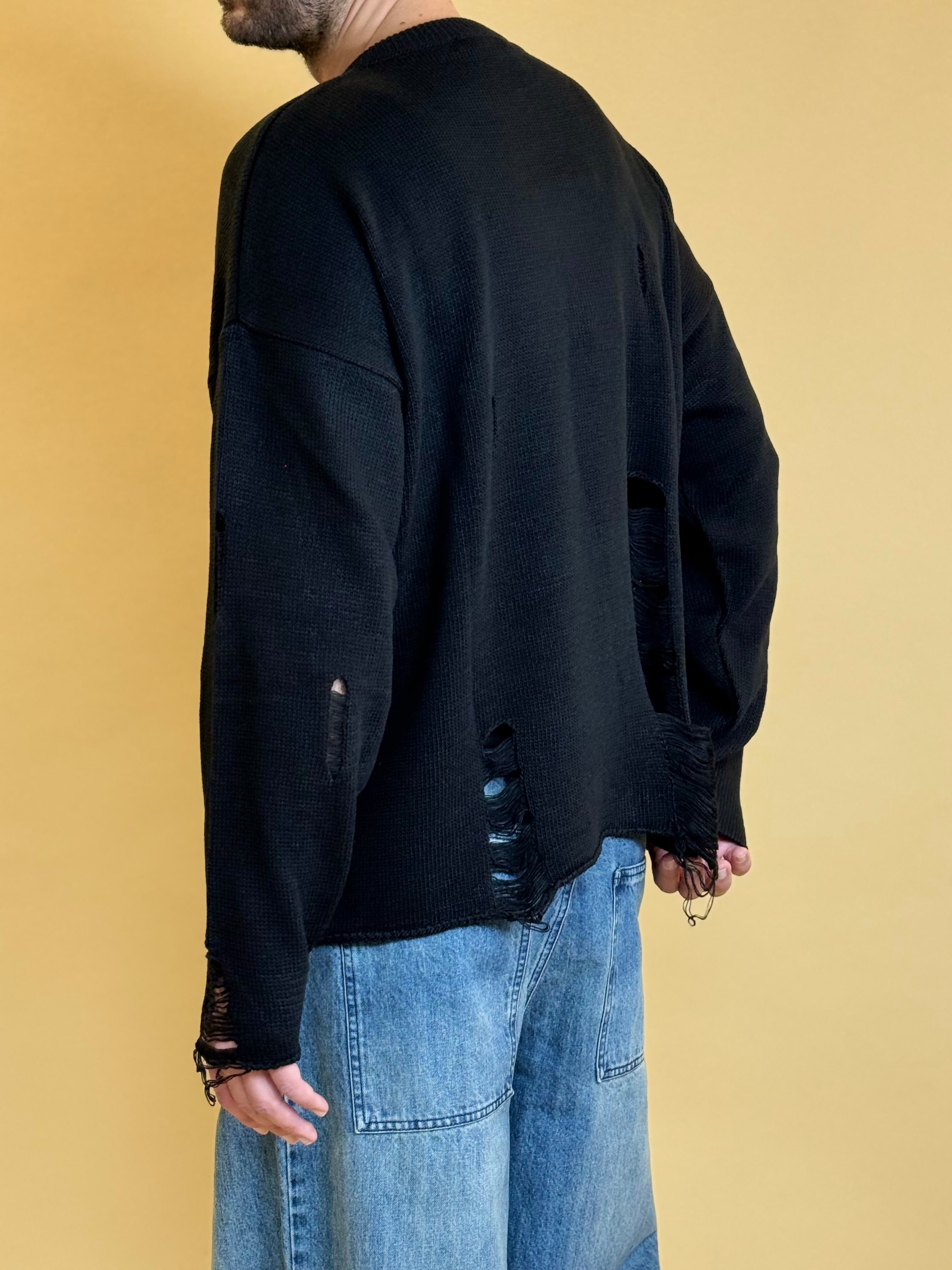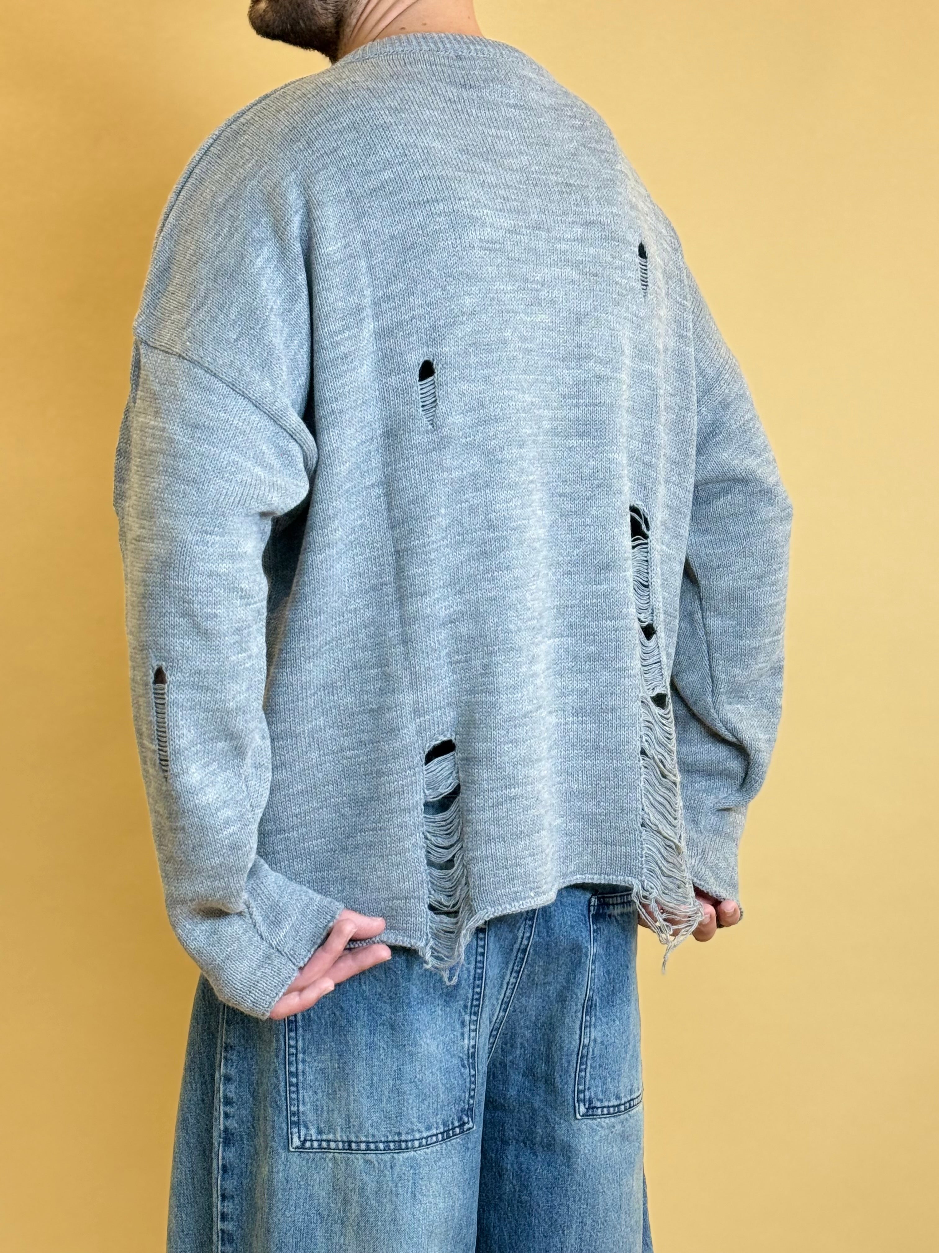 Maglione girocollo dalla vestibilità crop e leggermente oversize con dettagli di rotture ed abrasioni frontali, posteriori ed alle estremità delle maniche. Presenta costina esclusivamente al collo e fondo in taglio vivo. Disponibile in 2 varianti di colore.