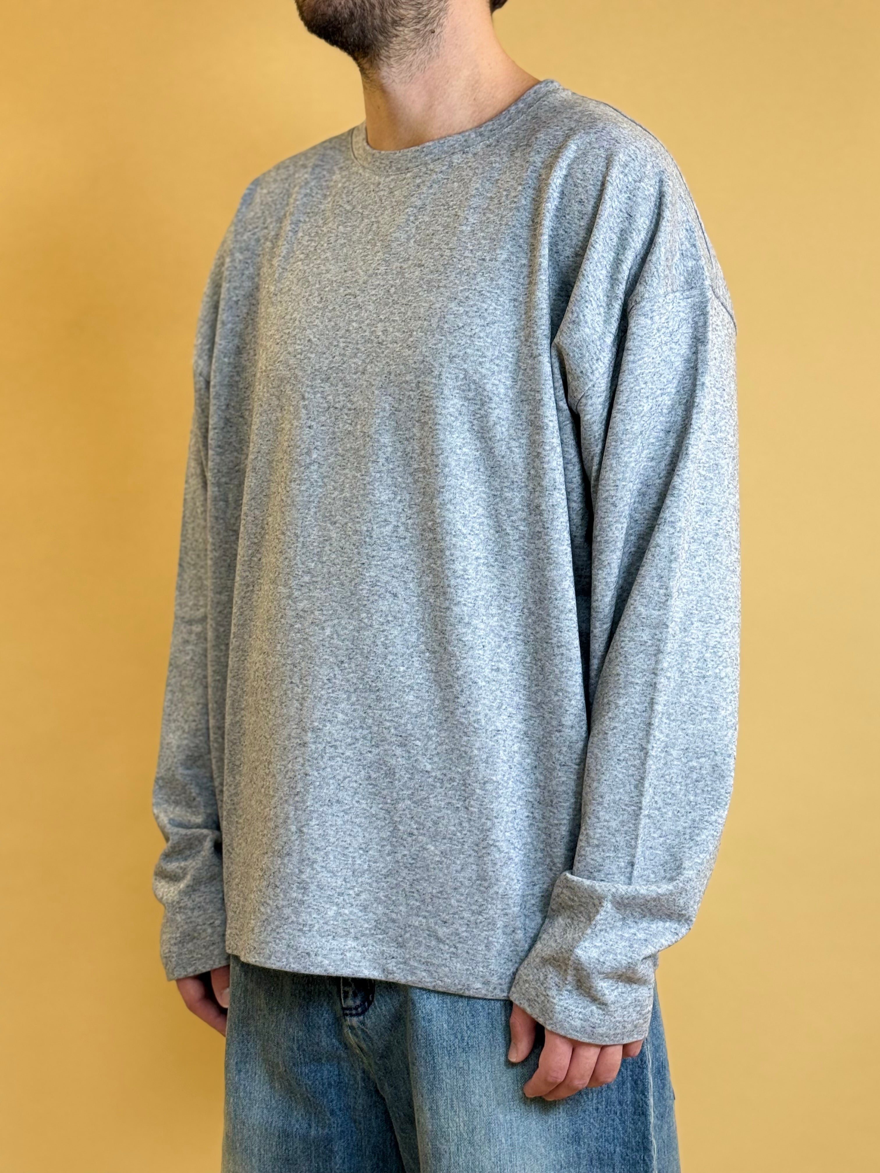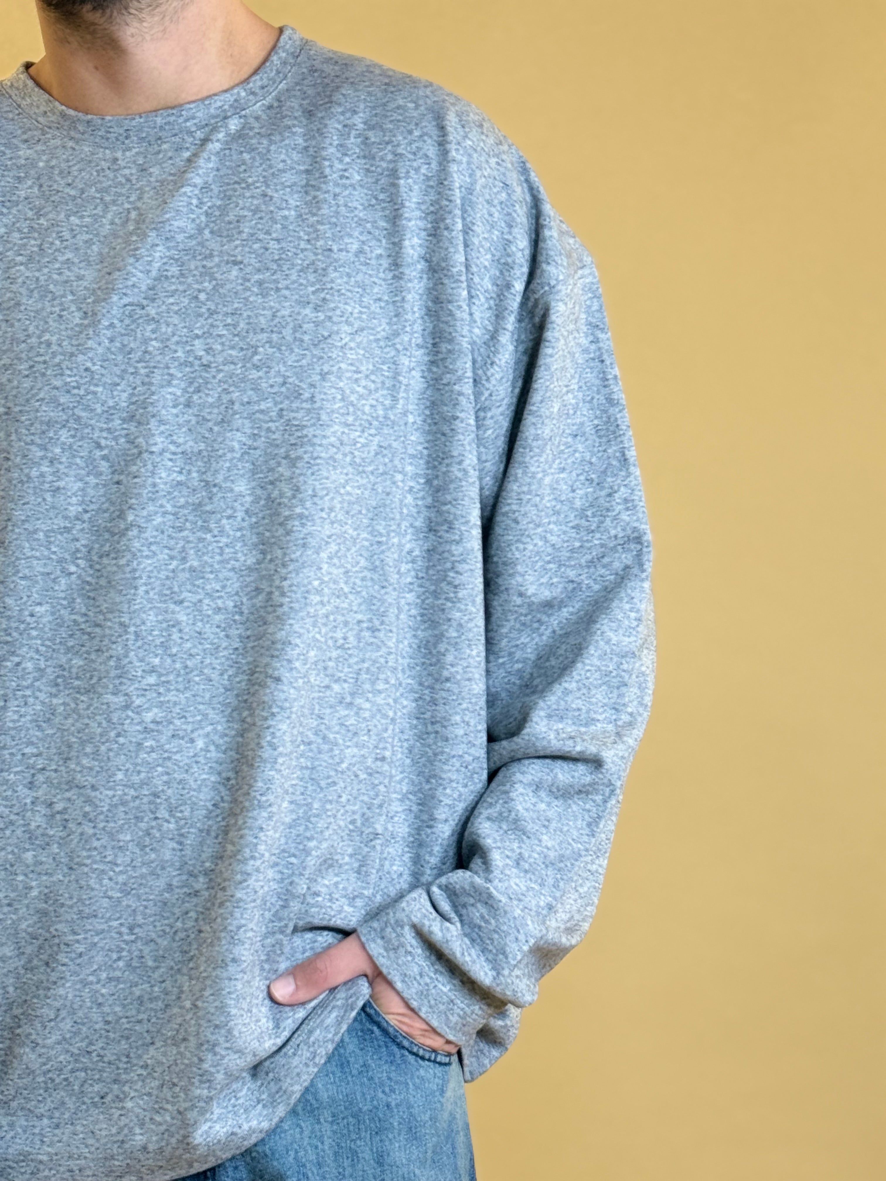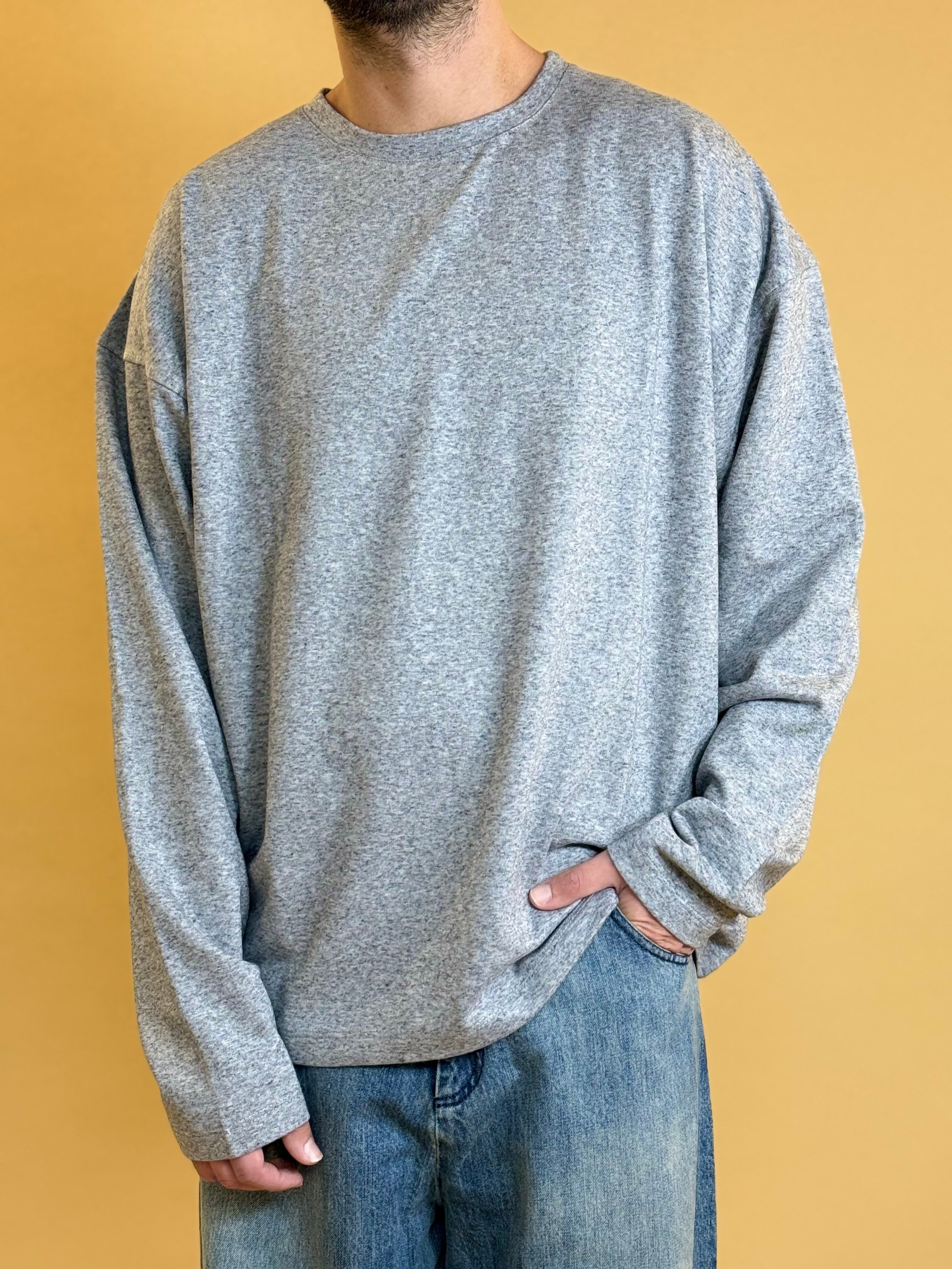 Longsleeve dalla vestibilità oversize realizzata su tessuto pesante in trama mélange, garzata internamente. E' disponibile in unica variante colore.