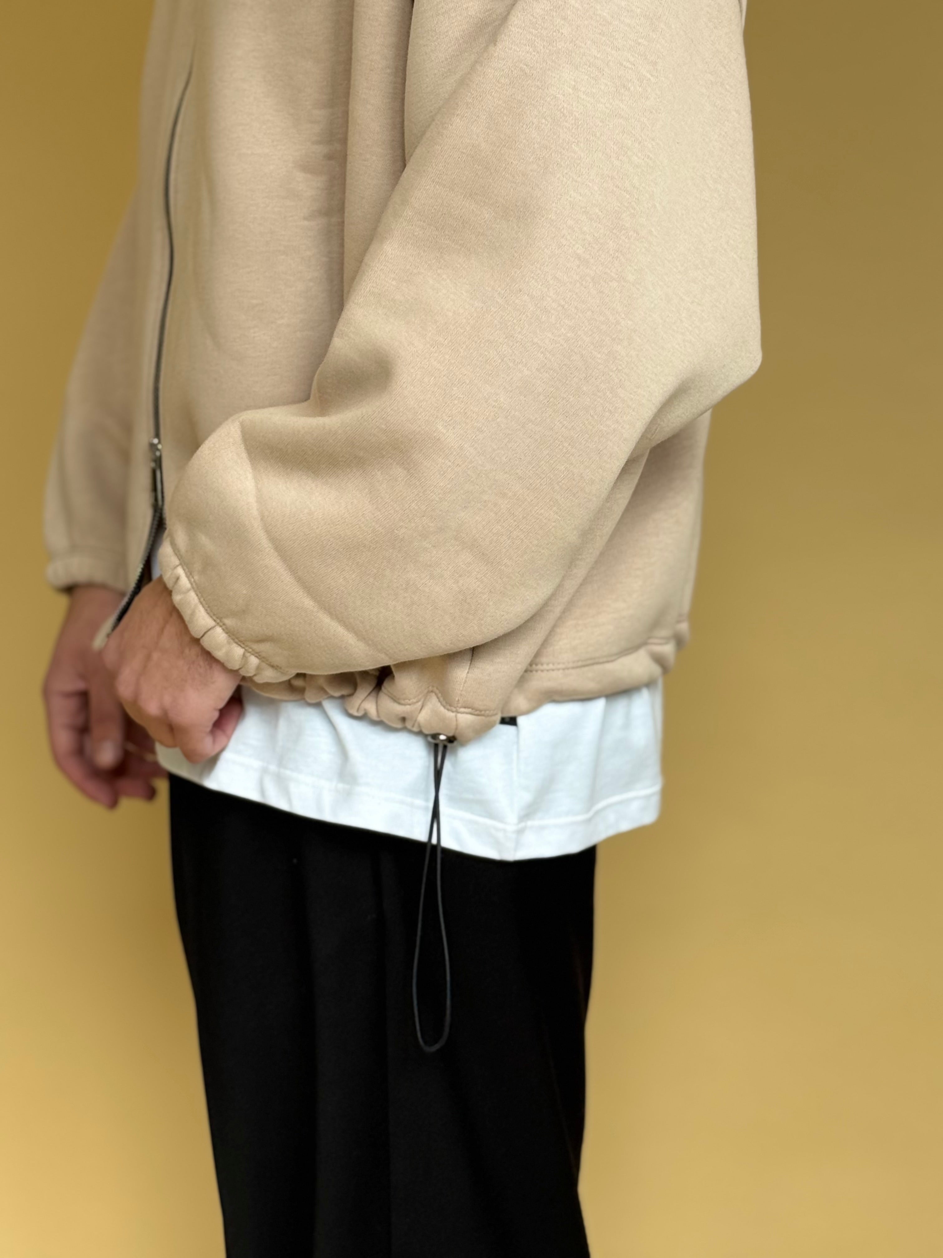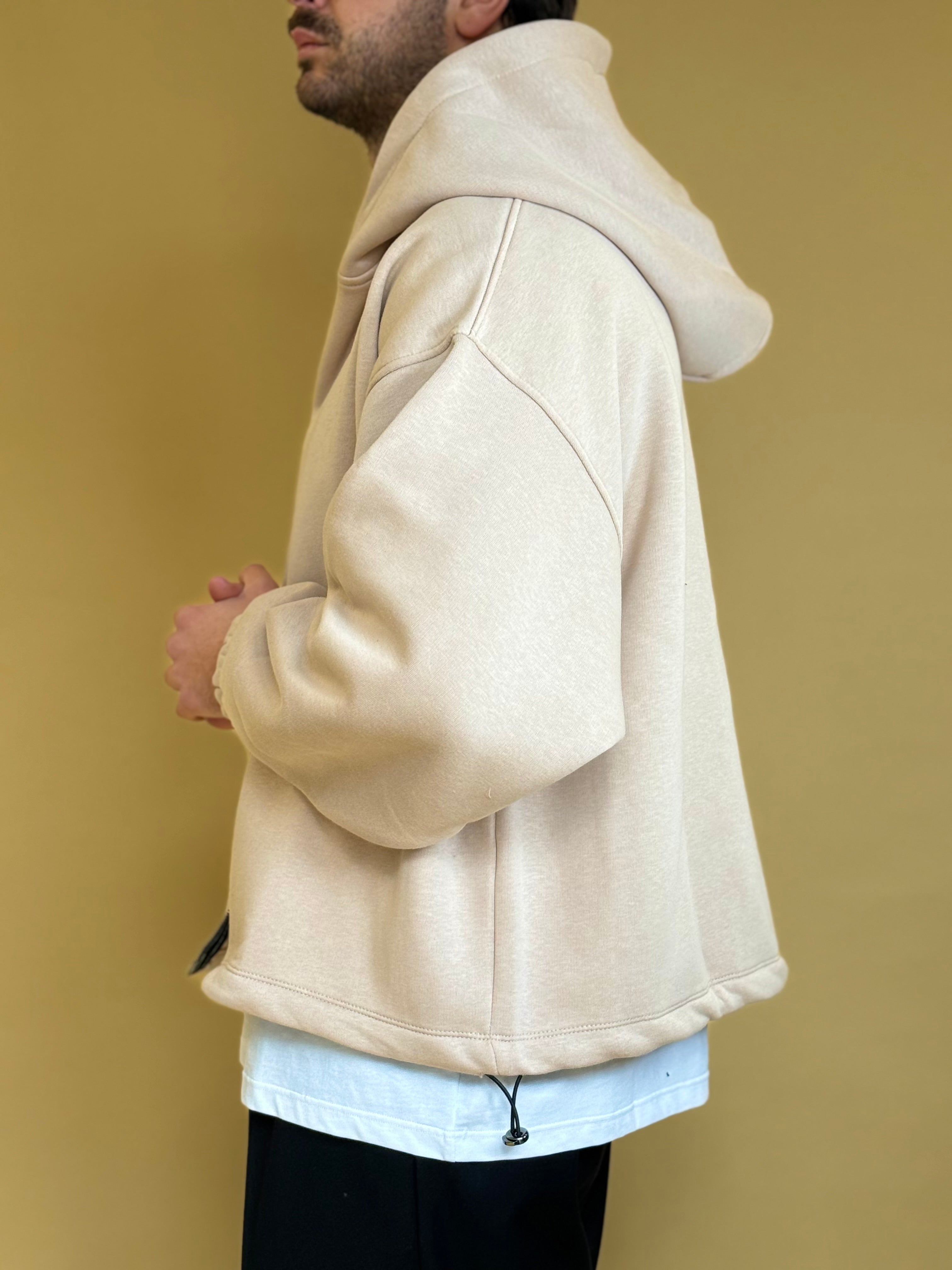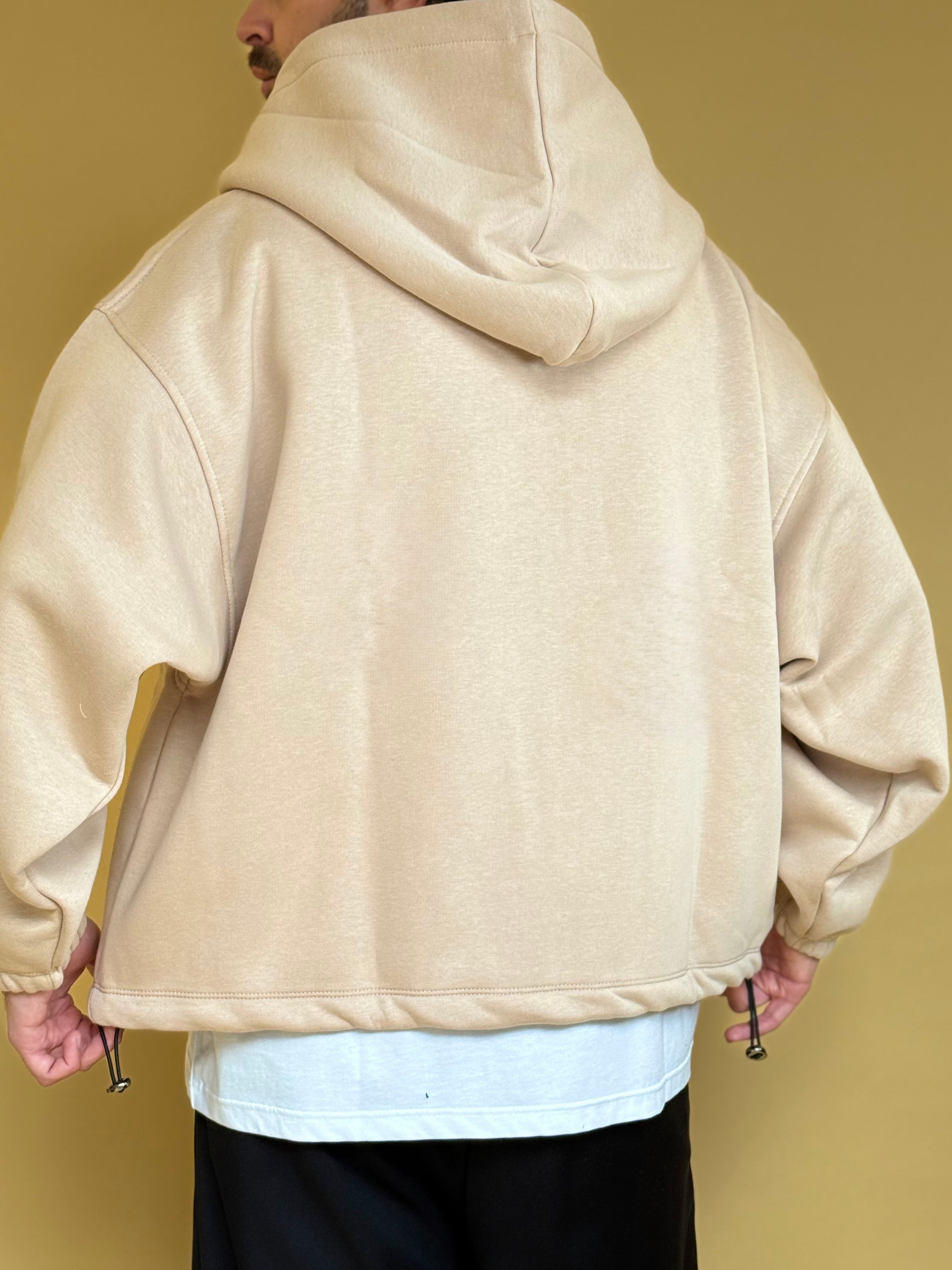 Felpa con cappuccio dalla vestibilità crop con taglio spalla oversize e polsi definiti con elastico. Presenta una chiusura full zip con doppio cursore ed elastico al fondo regolabile mediante una doppia coulisse che ne modifica il fit.