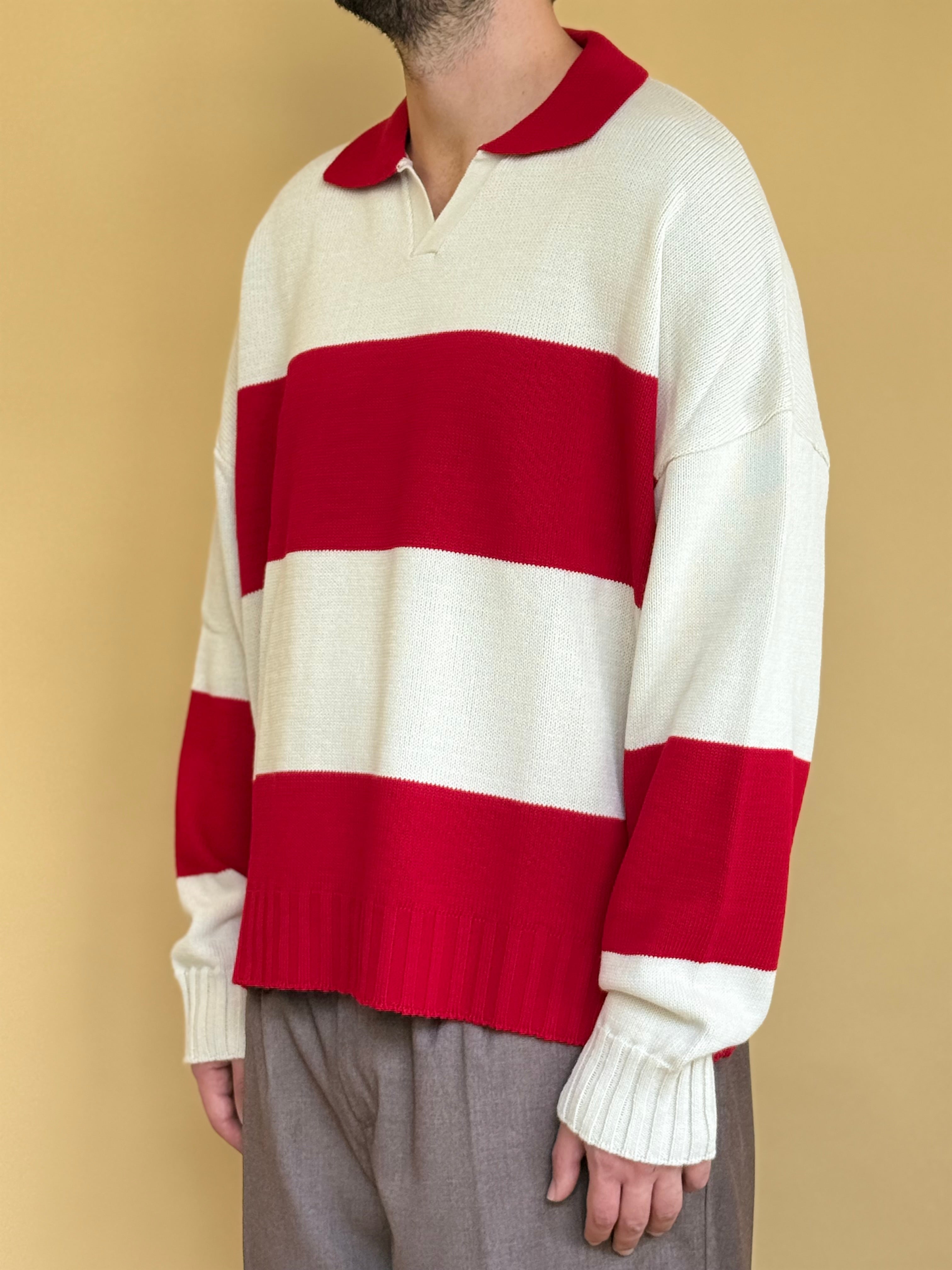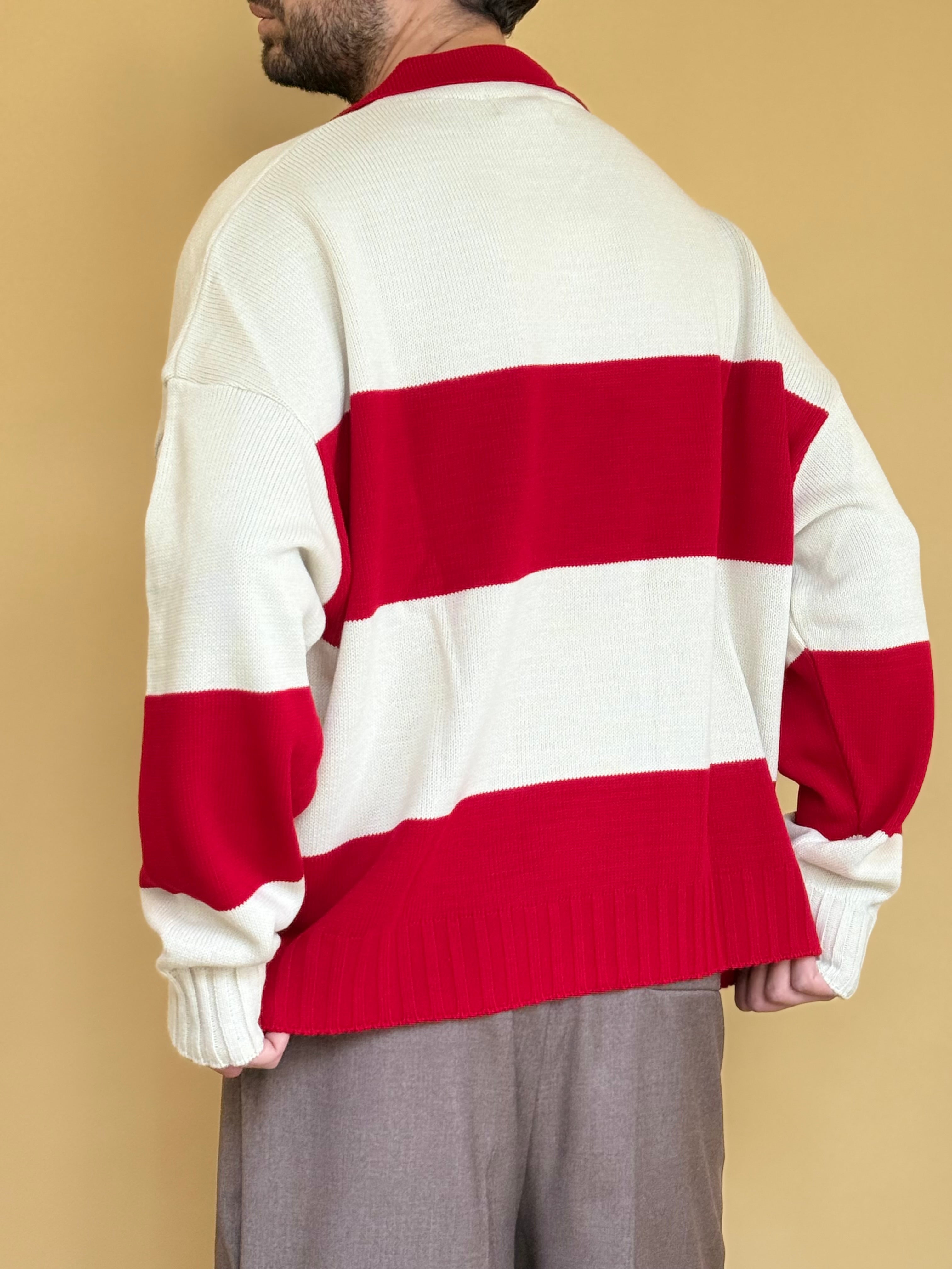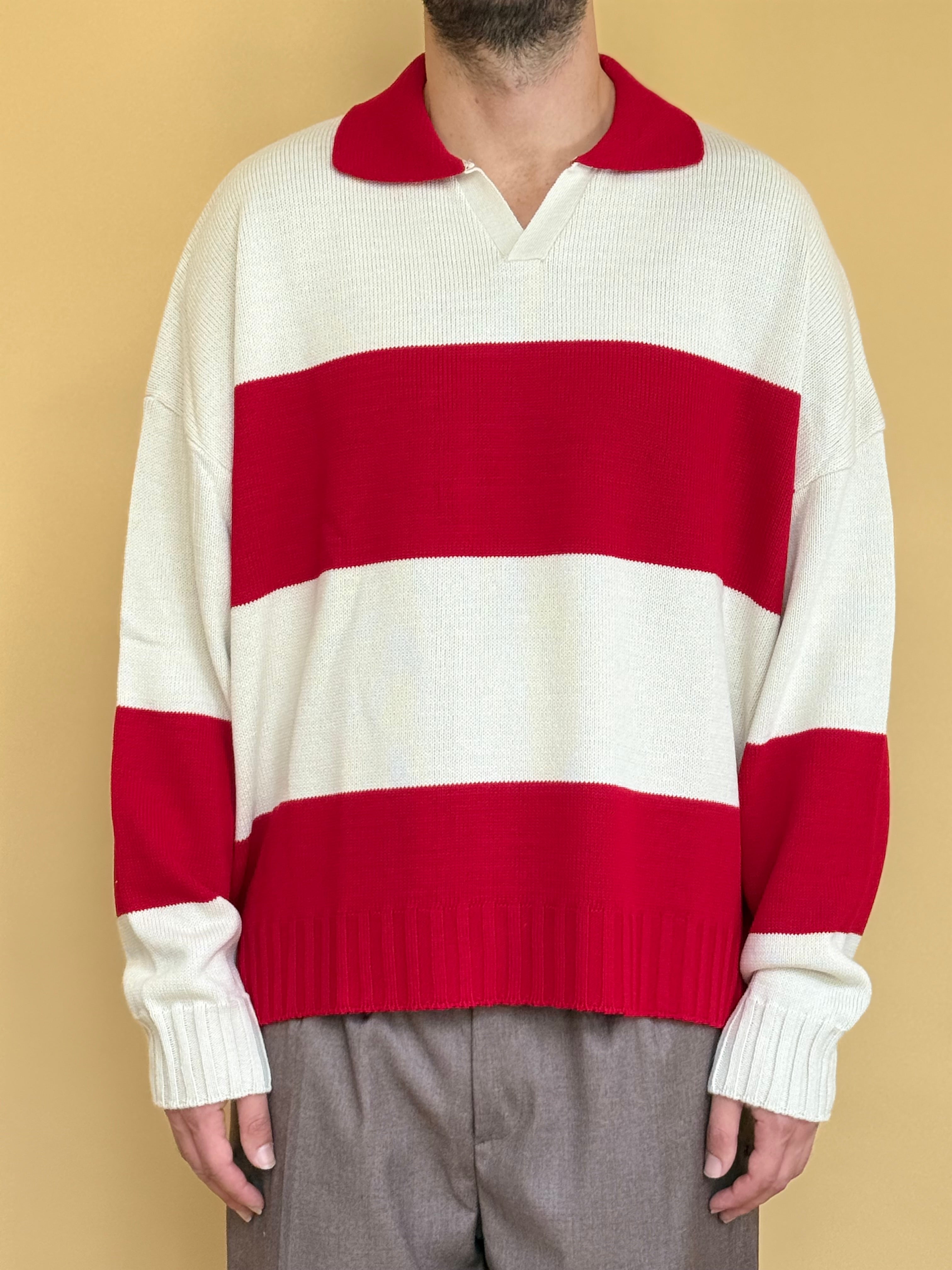 Maglione mod. polo dalla vestibilità crop leggermente oversize con trama bicolore a fasce e collo derby. Le estremità di polsi e balza non stringente sono definite in costina.