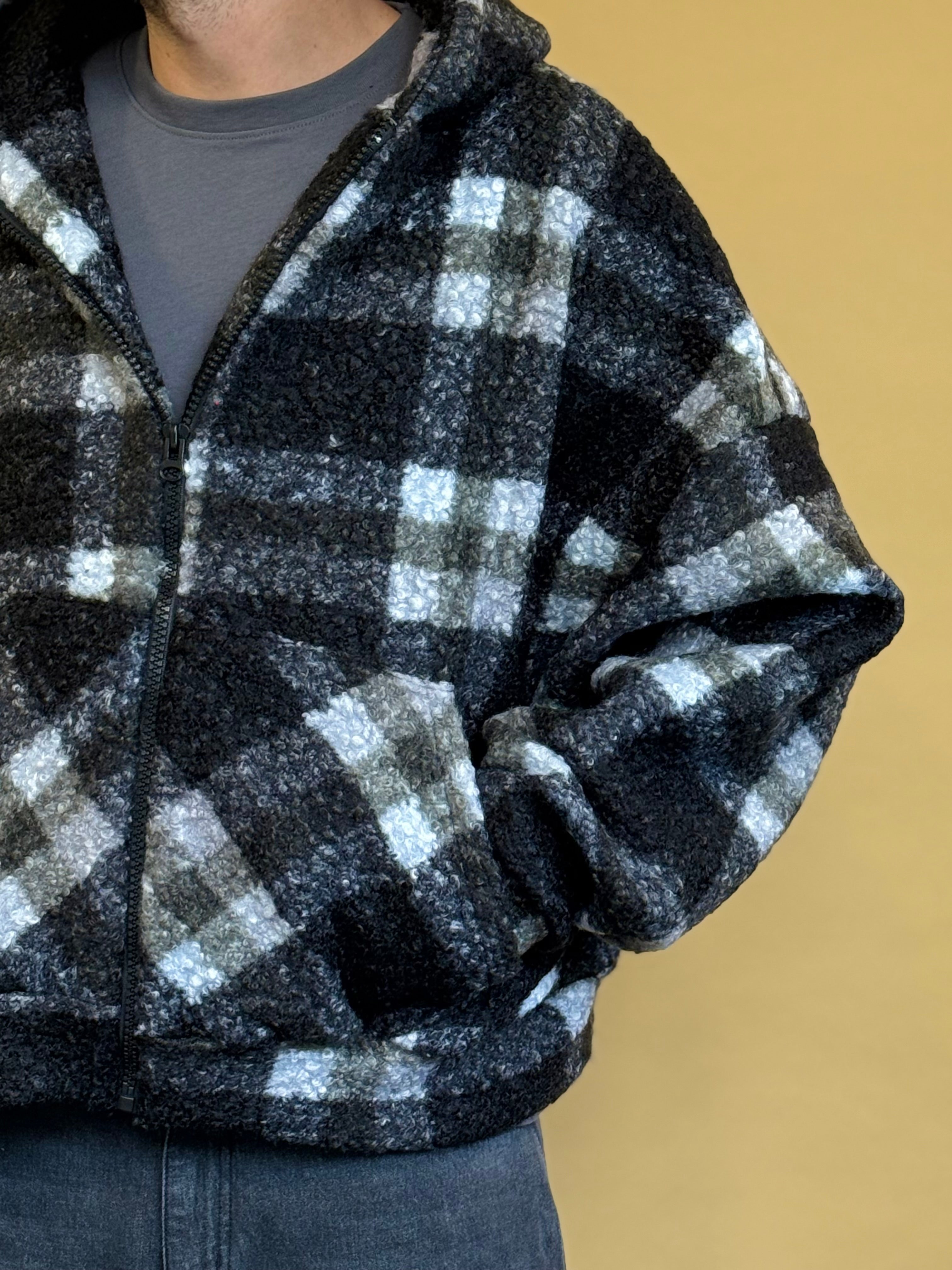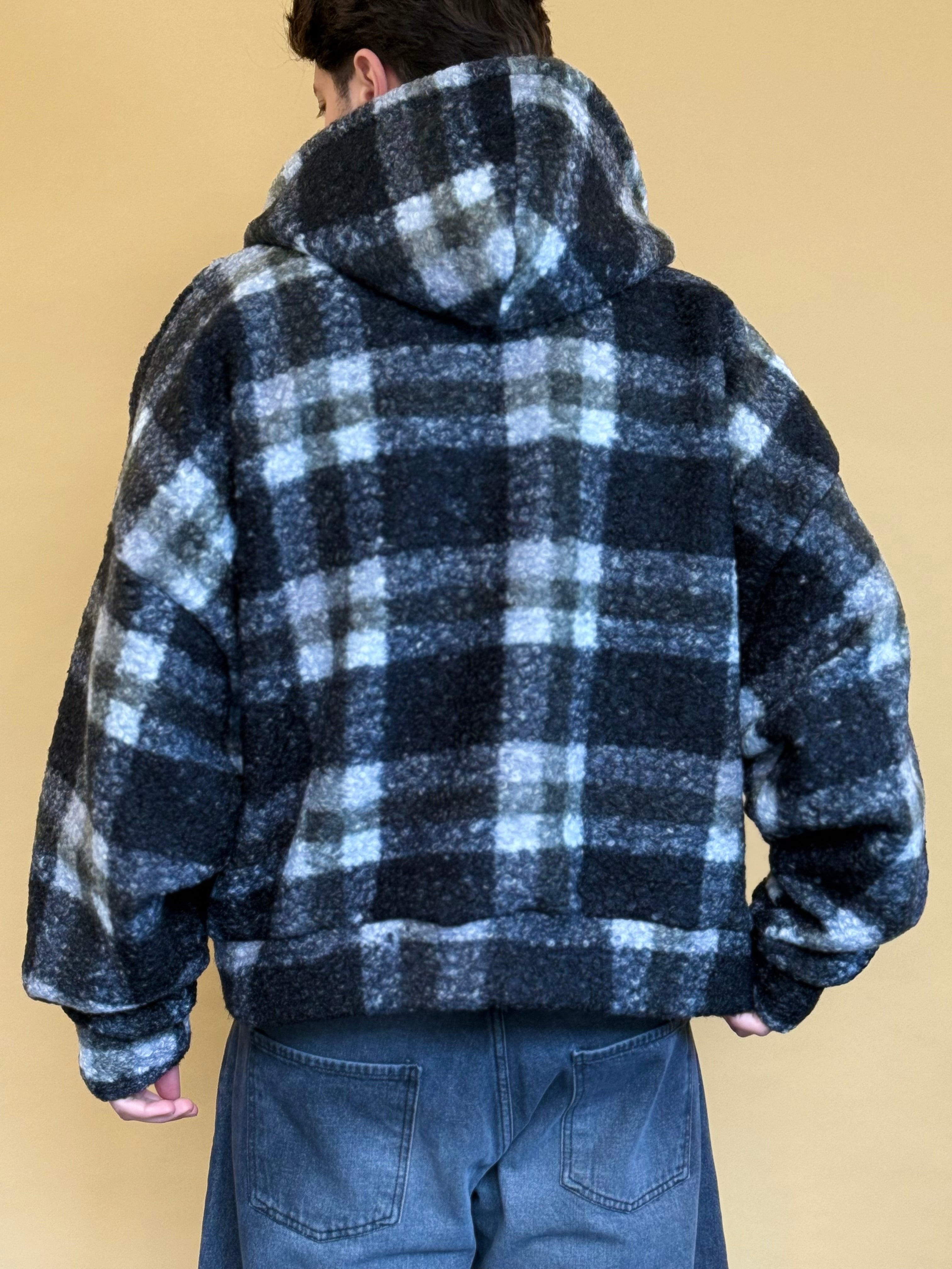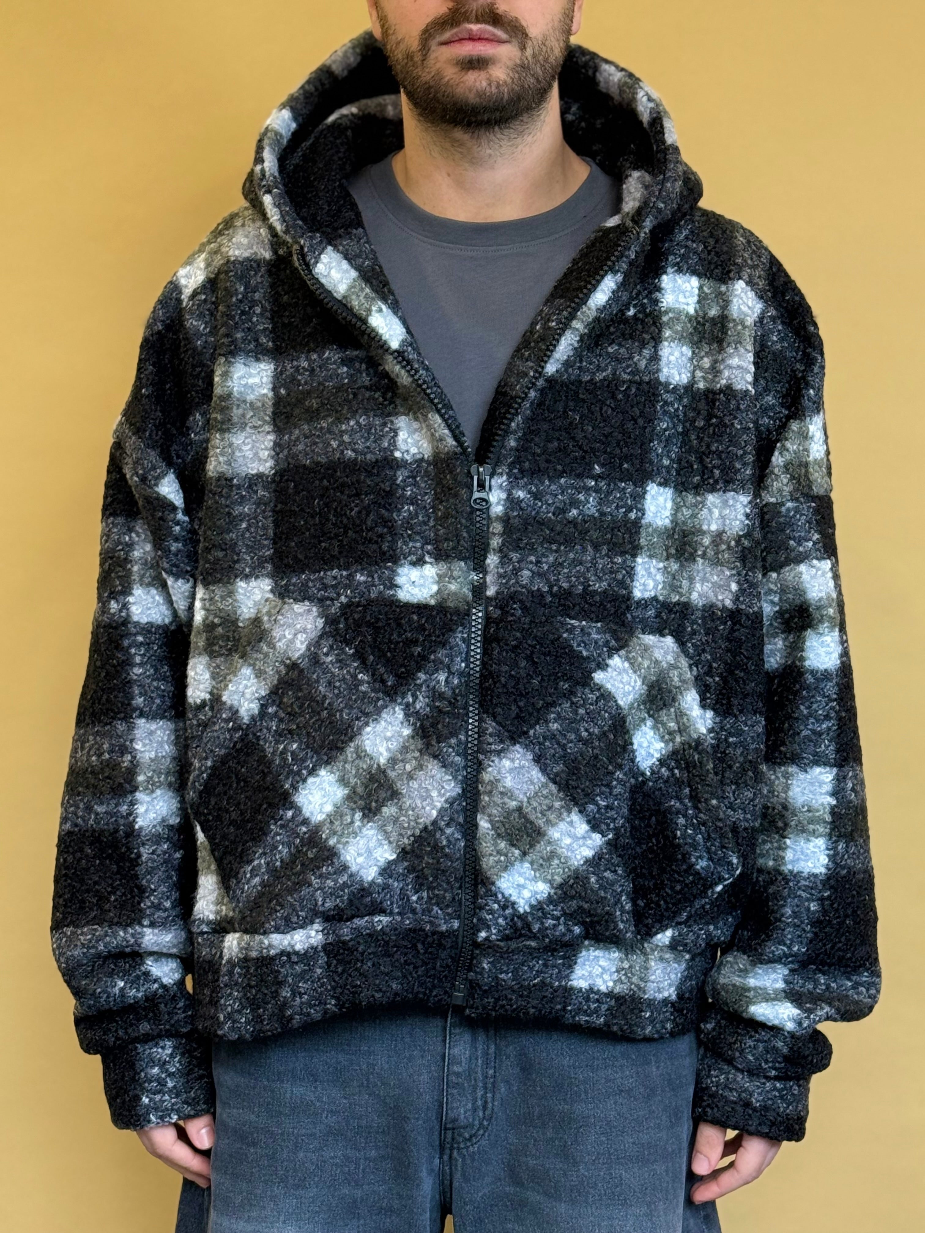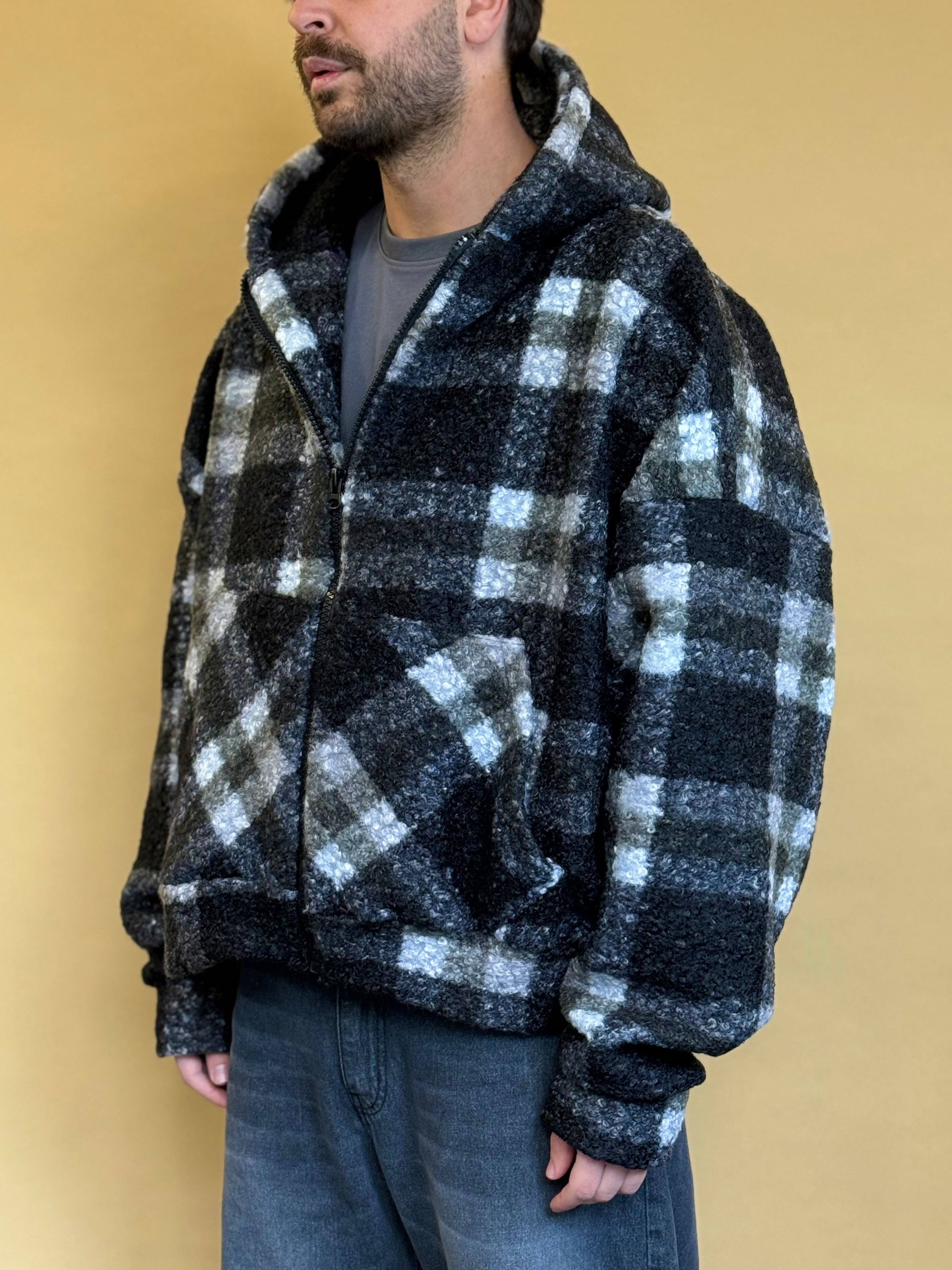 Giubbotto realizzato in maglia bouclè che dona al capo morbidezza e comfort. Presenta una fantasia a quadri, chiusura frontale a zip e cappuccio. Il fit è crop ed oversize ed è disponibile in unica variante colore.